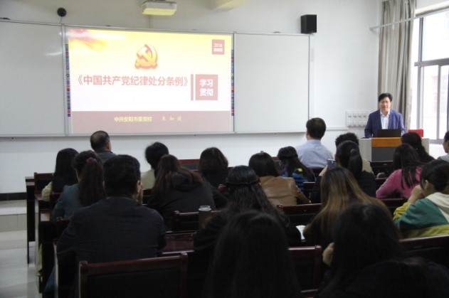 10月11日上午,市委党校朱如放副教授在洹滨校区106教室为全体教职工和学生干部代表上了一堂“不忘初心、牢记使命”主题教育专题党课。