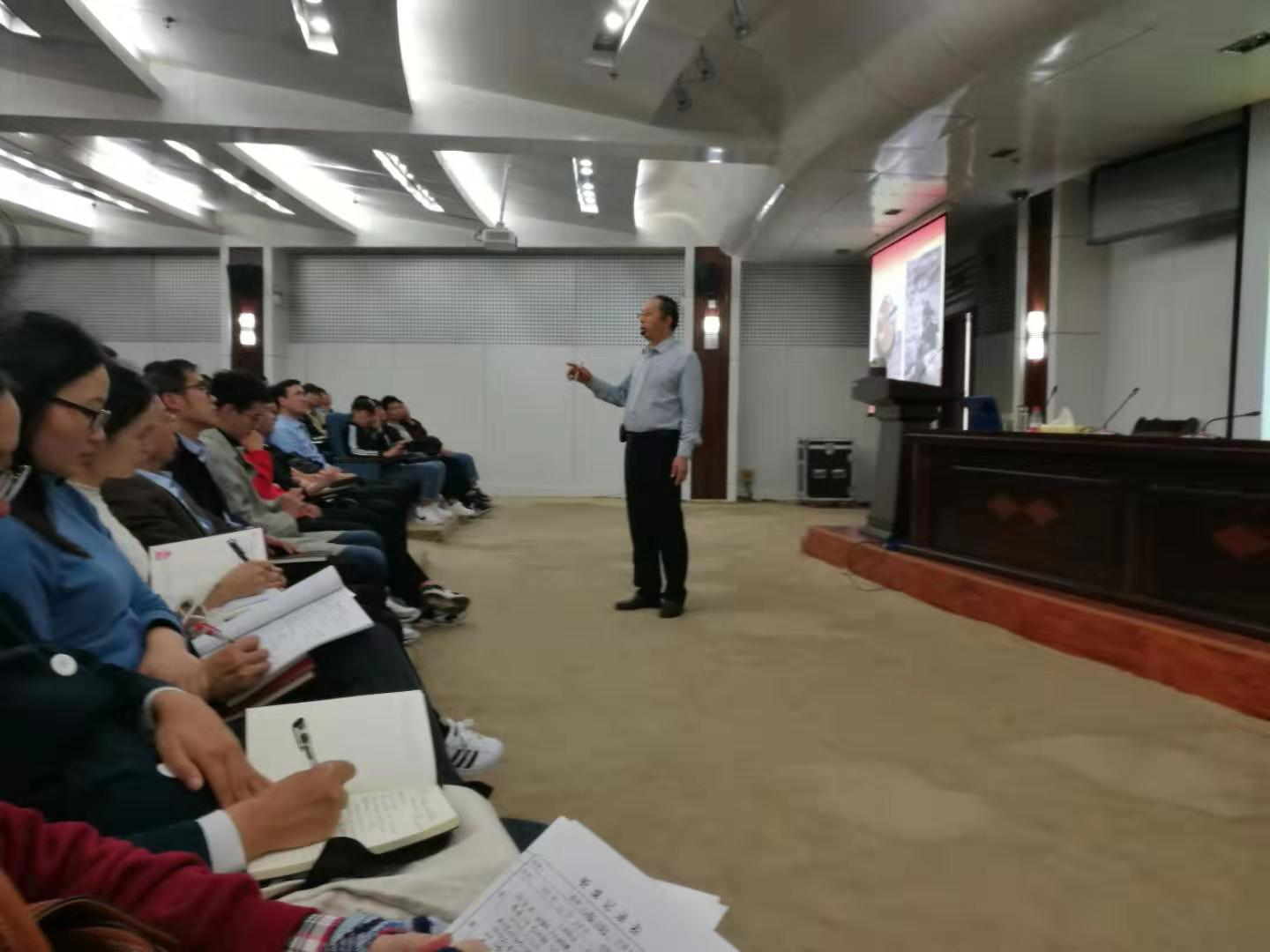 王希安教授以详实的图片和数据为师生们生动再现了林州共产党人带领人民用接近原始的工具在群山之腰修筑红旗渠的宏伟场景,通过杨贵、张买江、李春生等一个个鲜活的人物和故事,从多角度阐述了林州人民立足本地、依靠自身的自力更生精神,战天斗地、百折不挠的艰苦奋斗精神,顾全大局、齐心协力的团结协作精神,不计得失、不怕牺牲的无私奉献精神。他说,“让村民吃上水”是当年林州共产党人的初心,在林州共产党人的带领下,林州人民在一个不可能的时间、不可能的地方修建了不可思议的工程,这是一座伟大的精神丰碑,历久弥新,希望师生们能够弘扬践行红旗渠精神,不忘初心、牢记使命,多做贡献。