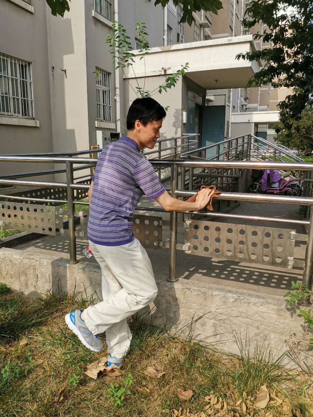 认真擦拭护栏