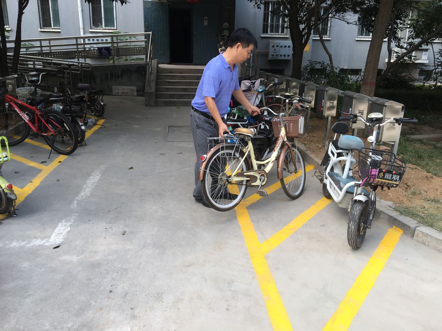 认真摆放自行车