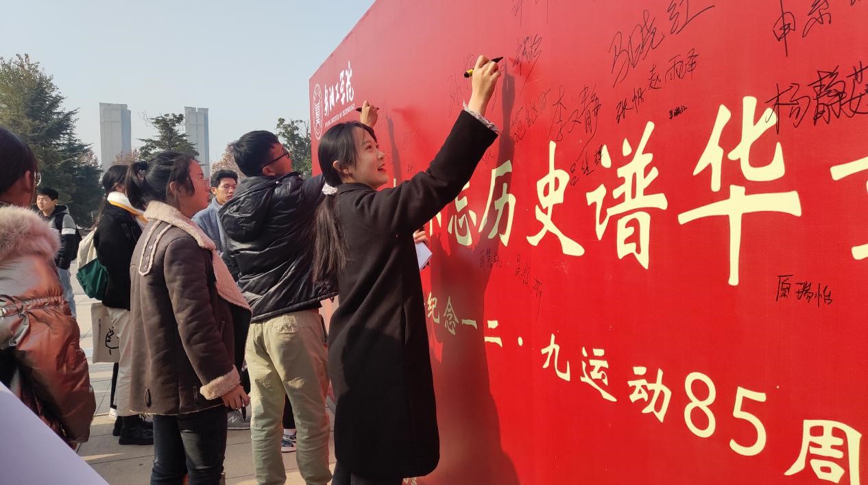 中午12点,校团委在图书馆前和至善湖旁边组织开展“齐心抗疫勇担当,不忘历史谱华章”主题签名活动。一千余名学生在“铭记‘一二·九’运动”的展板和条幅上签名。