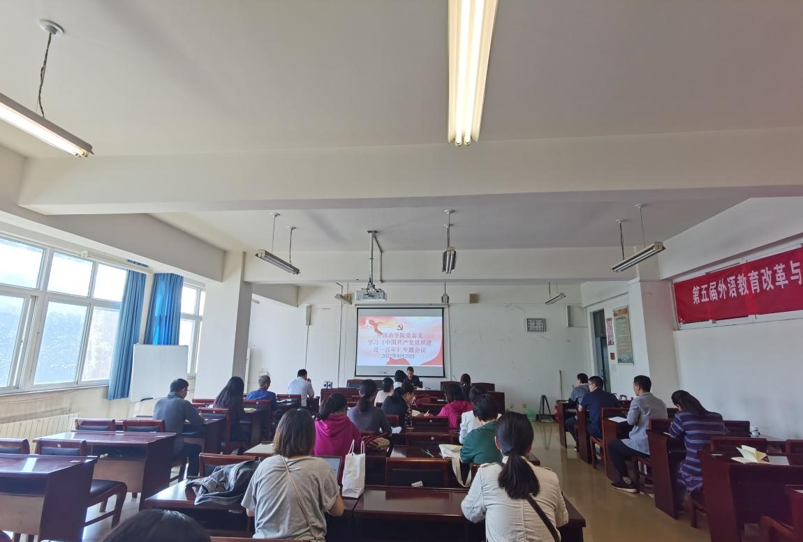 9月29日下午,外国语学院党总支在A10-205会议室召开党员大会,集中学习《中国共产党组织建设一百年》,党总支成员以及学院全体党员教师参加学习。