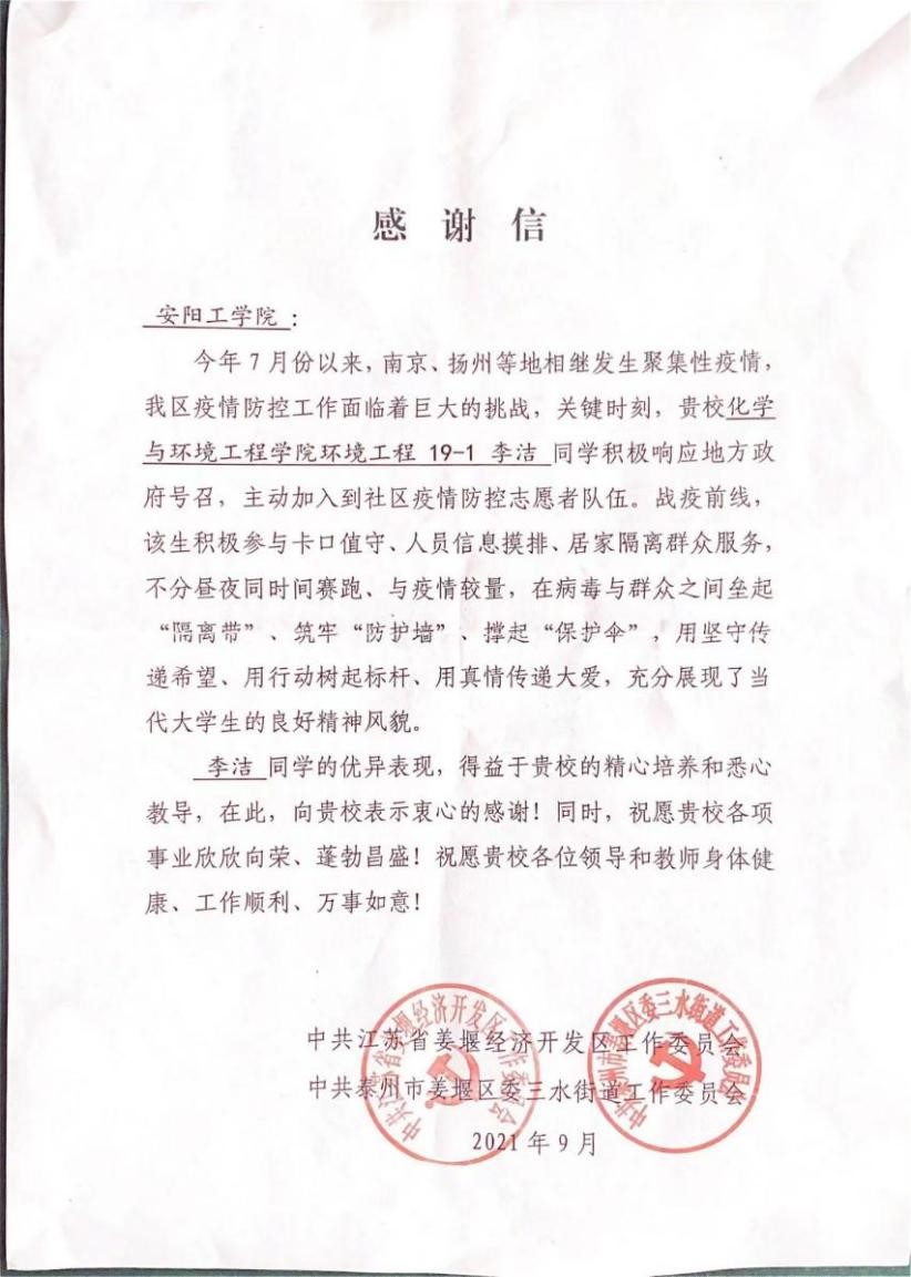 今年7月以来,江苏省南京市、扬州市等地相继爆发疫情,防疫工作形势严峻,任务艰巨,急需大量志愿者帮忙。李洁积极响应当地政府的号召,主动报名,在江苏省泰州市姜堰区参加社区疫情防控志愿服务工作。她每天在防疫卡点值守,对出入人员进行核验“双码”、测量体温、登记信息,并协助社区干部开展入户排查,安排重点地区返乡人员进行隔离,并做好跟踪管理服务。她不惧风险、不怕辛劳,不分昼夜、不计得失,始终坚守在抗疫一线,与时间赛跑,与疫情较量,为社会群众筑起一道安全“防护墙”。她用实际行动彰显了当代青年学生的责任感与使命感,收到当地政府致信表扬。她说;“做志愿者的日子里我最大的收获就是要学会为他人着想,很多老年人没有智能手机,无法出示行程码,更需要我们想办法开展好排查工作。”