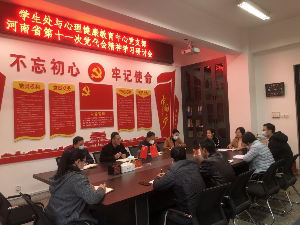 11月10日下午,学生处与心理健康教育中心党支部在B02-207会议室召开理论学习会议,专题学习研讨河南省第十一次党代会精神。党支部书记王振宇主持会议,支部全体党员参加学习研讨。