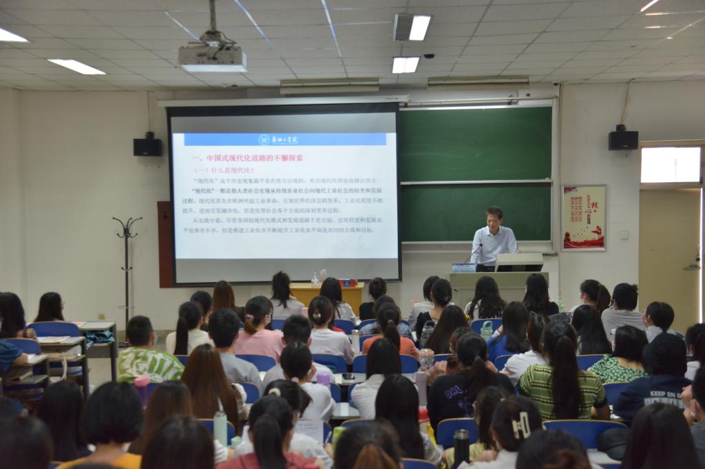 课堂上,蒋文龙从“什么是现代化” “西方的现代化” “马克思对西方现代化的评价”和“我国现代化道路的探索四个方面”,对“中国式现代化道路的不懈探索”进行讲解;从“独立自主性” “中华底色”和“天下情怀”三个方面讲述了中国式现代化道路的鲜明特征;从“中国式现代化道路是中华民族伟大复兴的必由之路” “中国式现代化道路是21世纪科学社会主义的成功之路” “为发展中国家实现现代化提供了有益借鉴”和“中国式现代化道路破解了人类发展的许多难题”四个方面详细介绍中国式现代化道路的重大意义。