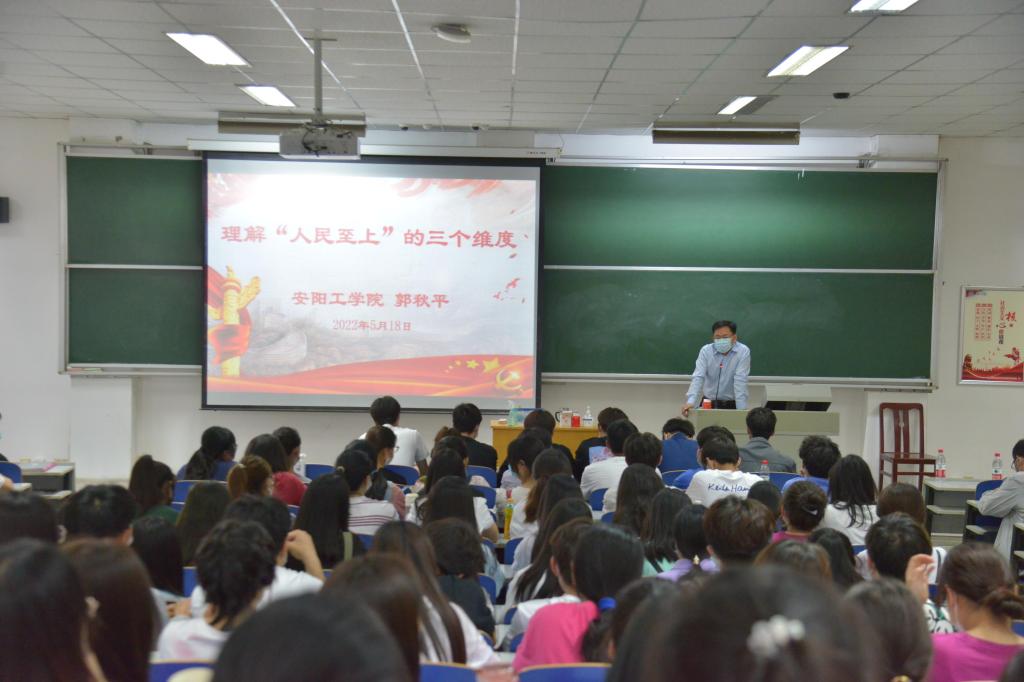 5月18日上午,副校长郭秋平以《理解“人民至上”的三个维度》为题,为艺术设计学院2021级环境设计和产品设计专业130多名学生上思政课。