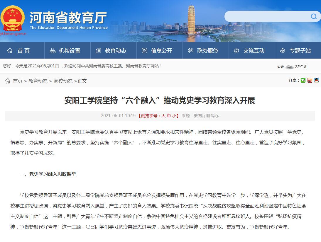 【媒体安工】河南省教育厅官网:安阳工学院坚持“六个融入”推动党史学习教育深入开展