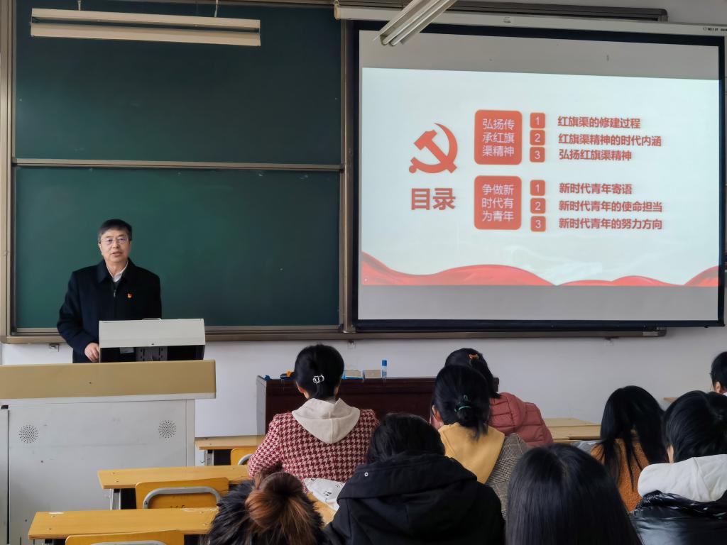 11月15日下午,副校长万鹏杰以《弘扬红旗渠精神 争做新时代有为青年》为题,为外国语学院商务英语22级2班学生及汉语国际教育教研室教师讲思政课。