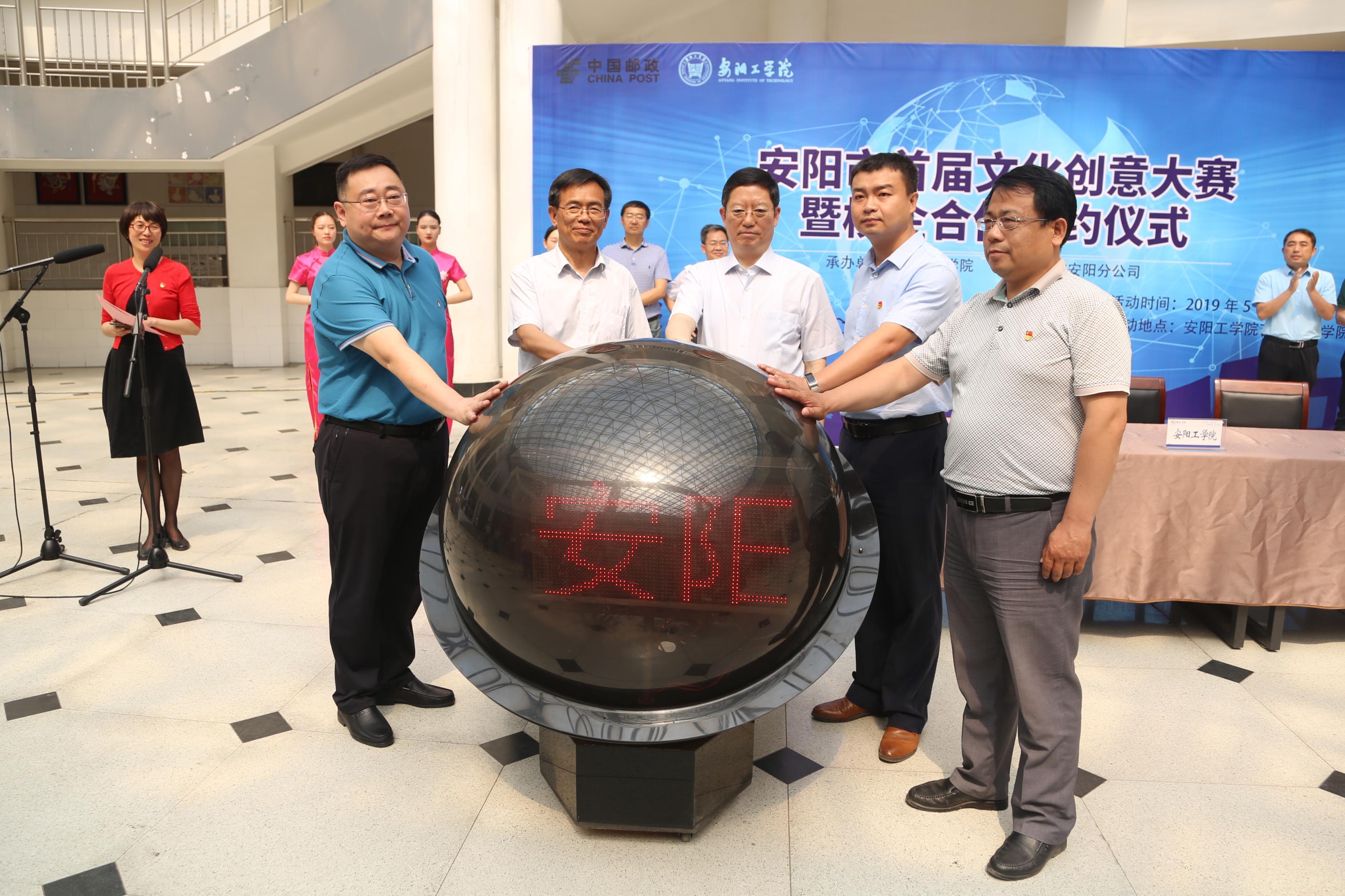 仪式最后,安阳市市委宣传部副部长张健、共青团安阳市市委副书记元浩、安阳市文化广电体育旅游局副局长李齐越、中国邮政集团公司安阳分公司总经理程豪岭和校长景国勋共同启动了安阳市首届文化创意设计大赛。