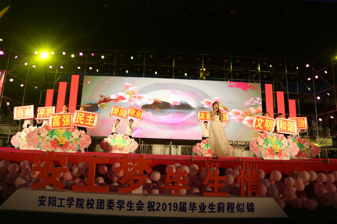 第三篇章《感恩·祝福》。合唱《我喜欢》诉说着大学生活的点滴,表达同学们对母校的热爱与留恋;民族舞蹈《繁花》充满异域风情,令人耳目一新;藏族同学们带来的《吉祥如意》,欢快的歌舞送去对毕业生的祝福;朗诵《不一样的年代一样的青春》表达安工学子报效祖国的青春愿望。最后,三位老师演唱的歌曲《我和我的祖国》把晚会推向了高潮。