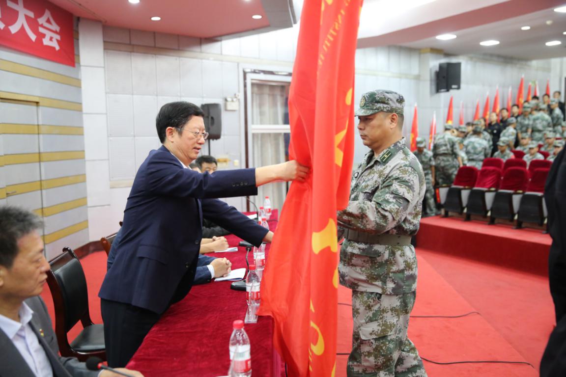 大会在雄壮的国歌声中拉开帷幕。景国勋为承训单位授2019级军训团旗,军训团长向各营授旗。