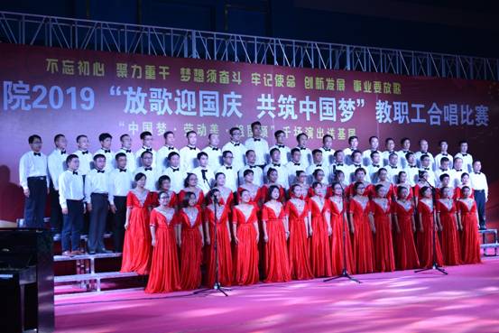 在离退休老教师倾情献唱的《我家在中国》和《浏阳河》中比赛正式开始。现场高潮迭起,气氛热烈,13支参赛队伍着装整齐,精神饱满,斗志昂扬。《向往》、《雕花的马鞍》、《今天是你的生日,中国》、《长江之歌》、《歌唱祖国》、《共圆中国梦》、《唱支山歌给党听》等脍炙人口的歌曲先后唱响,熟悉的旋律,深情的演唱,展现了新中国走过的70年光辉历程,抒发了教职工的爱国情怀。其中,经济管理学院演唱的《唱支山歌给党听》情谊深切,将所有党员的心声娓娓道来;机关联队演唱的《走向复兴》气势恢弘,表达了身为中华儿女的自豪与骄傲;土木与建筑工程学院演唱的《共圆中国梦》激情洋溢,唱出了为实现伟大复兴中国梦的决心和信心;生物与食品工程学院和外国语学院演唱的《我的祖国》铿锵有力,抒发了对祖国、对家乡的无限热爱。