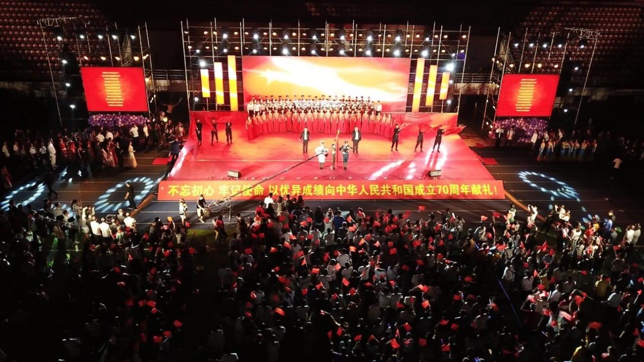 “五星红旗迎风飘扬,胜利歌声多么响亮,歌唱我们亲爱的祖国,从今走向繁荣富强......”最后,全场7000余名师生挥舞着手中的国旗,齐声高唱《歌唱祖国》,再一次将晚会推向高潮,优美的旋律,真挚的感情,表达了师生们对新中国成立70周年的美好祝愿。晚会在师生们礼赞祖国的歌声中落下帷幕!