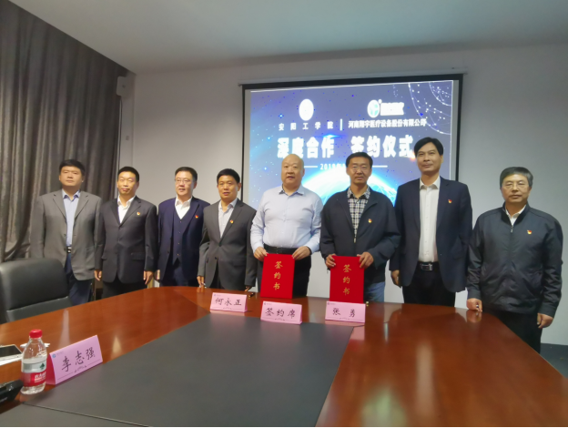 随后,在内黄翔宇医疗设备股份有限公司举行了校企深度合作签约仪式,仪式上,内黄翔宇医疗设备股份有限公司向我校提供100万元经费,用以开展科技合作。仪式结束后,双方就下一步深度合作进行了座谈交流。座谈会上,任中普发表讲话,他说,开展“校地结对帮扶”精准扶贫工作是贯彻落实省委、省政府关于打好精准脱贫攻坚战决策部署的要求,是发挥高校“社会服务”职能的要求,是实施“校企合作、产教融合”人才培养模式改革的要求,希望在下一步的工作中,学校各相关部门要以“不忘初心、牢记使命”主题教育为契机,主动与内黄县相关企业和行业对接,深入开展交流合作,助推“校地结对帮扶”精准扶贫工作再上新的台阶。