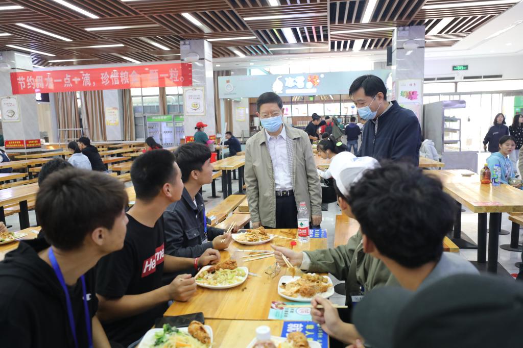 校长景国勋在学生餐厅与就餐学生亲切交谈