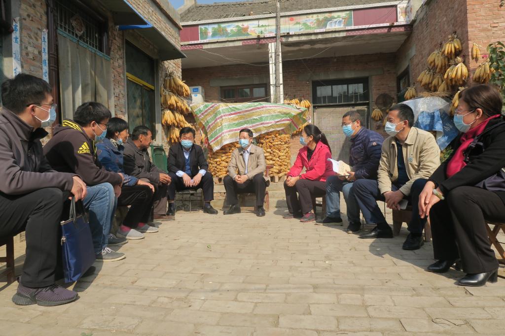 在刘闵城村,景国勋一行与濮阳县委常委、副县长袁素平,渠村乡党委书记管世仲,渠村乡乡长任伟杰和我校驻村干部郭强、张林等人进行了座谈交流,听取并了解了刘闵城村常态化疫情防控工作、脱贫攻坚普查准备工作、近期脱贫攻坚开展情况、脱贫攻坚工作措施及今后的工作思路等。