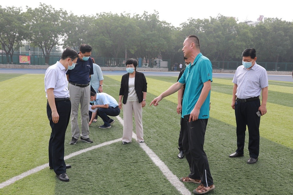 张玲在我校1号体育场查看人工草坪损坏情况