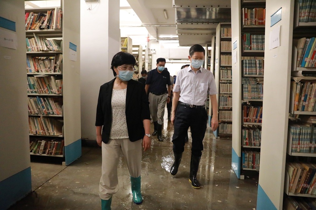 张玲在我校图书馆地下室调研受灾情况