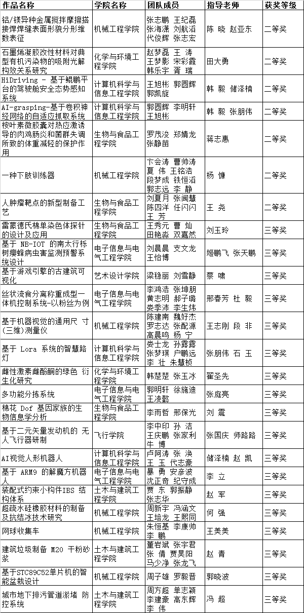 本届“挑战杯”竞赛自今年3月启动,包括校赛、省级初审、省级终审等环节。我校团委精心组织,择优推选出了36项作品参加省赛,最终获奖25项。其中,机械工程学院、生物与食品工程学院、计算机科学与信息工程学院分别获得二等奖2项,化学与环境工程学院获得二等奖1项。
