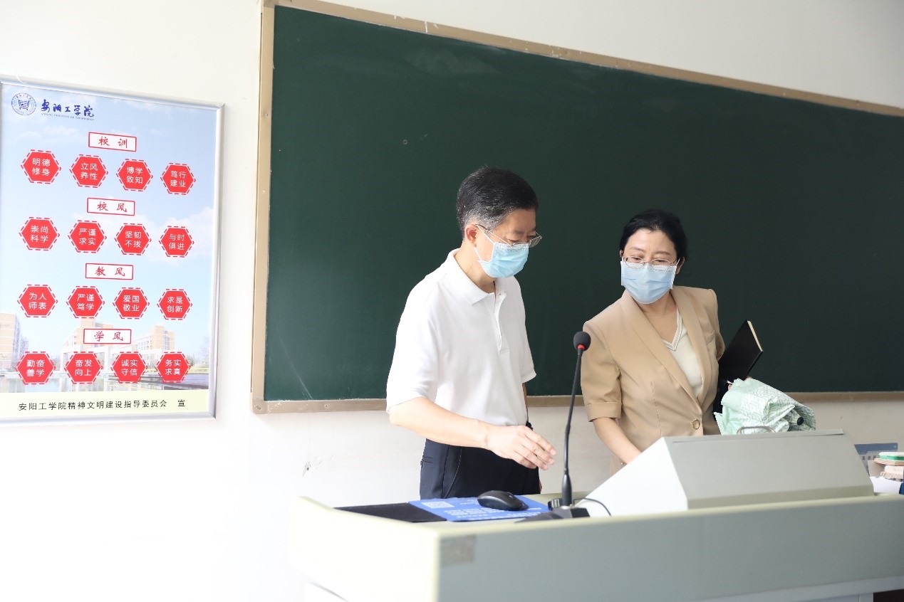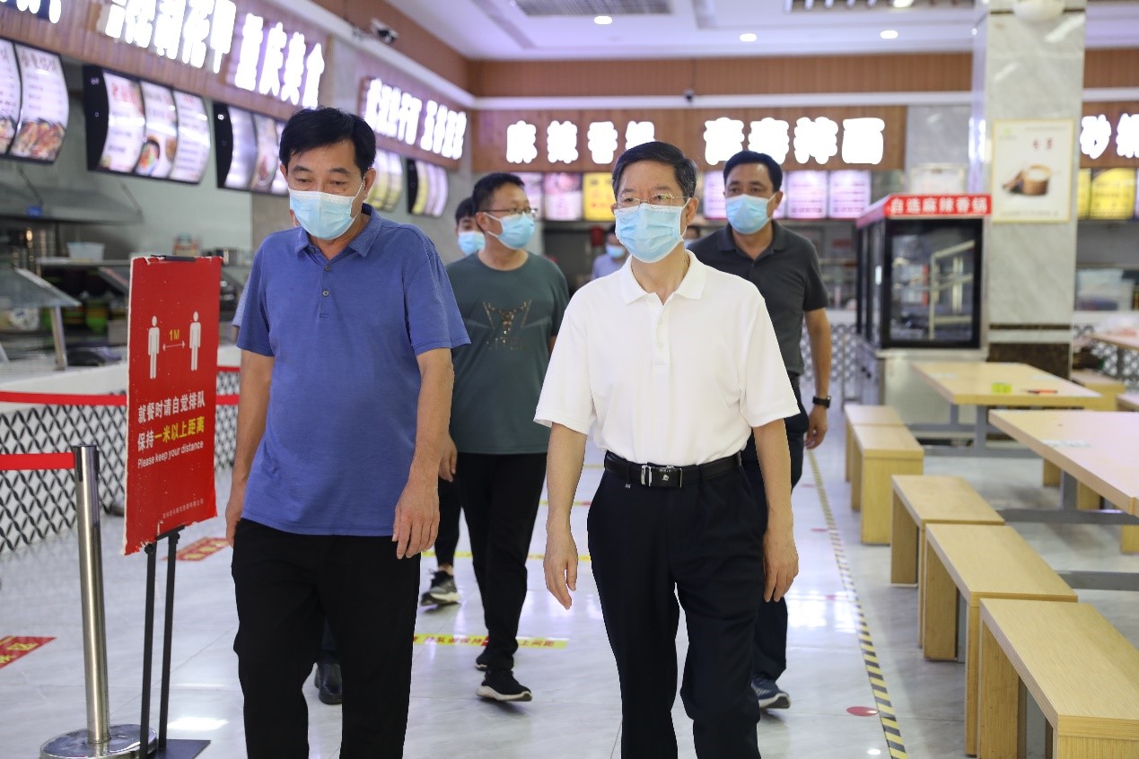 景国勋一行先后到校门口、A02教学楼、一号餐厅、善工苑学生公寓等处,现场检查指导疫情防控、教学设备准备、校园环境整治、防疫物资储备、安全隐患治理等各项工作,听取相关部门秋季开学各项工作准备情况,全面查看疫情防控各环节,并检查指导防控实战演练。